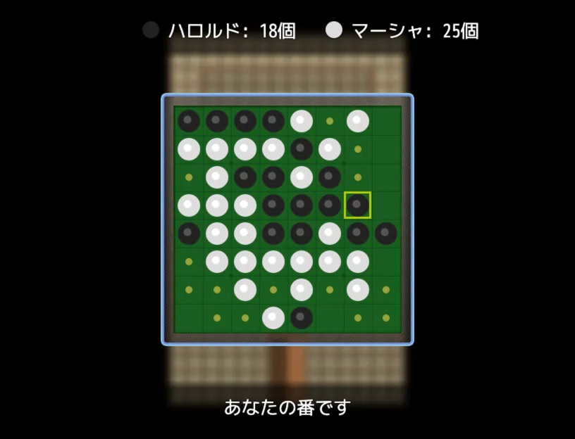 ゲーム内では盤面が変化する「ウィザーリバーシ」として実装されていましたが、配布版では8×8のシンプルなオセロゲームとしてプラグイン化しました。盤面・駒などの画像はプラグインが自動生成するため、素材を自力で用意する必要はありません。